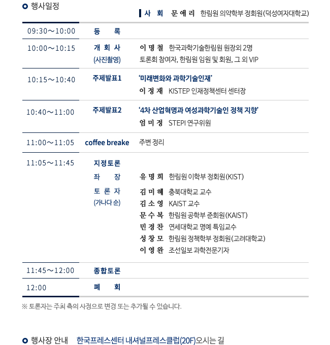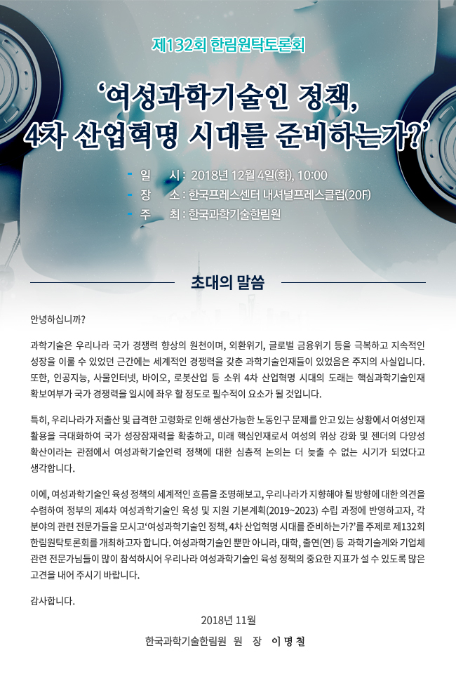 [세미나] 제 108회 한림원탁토론회(4차 산업혁명시대에서 젠더혁신의 역할)