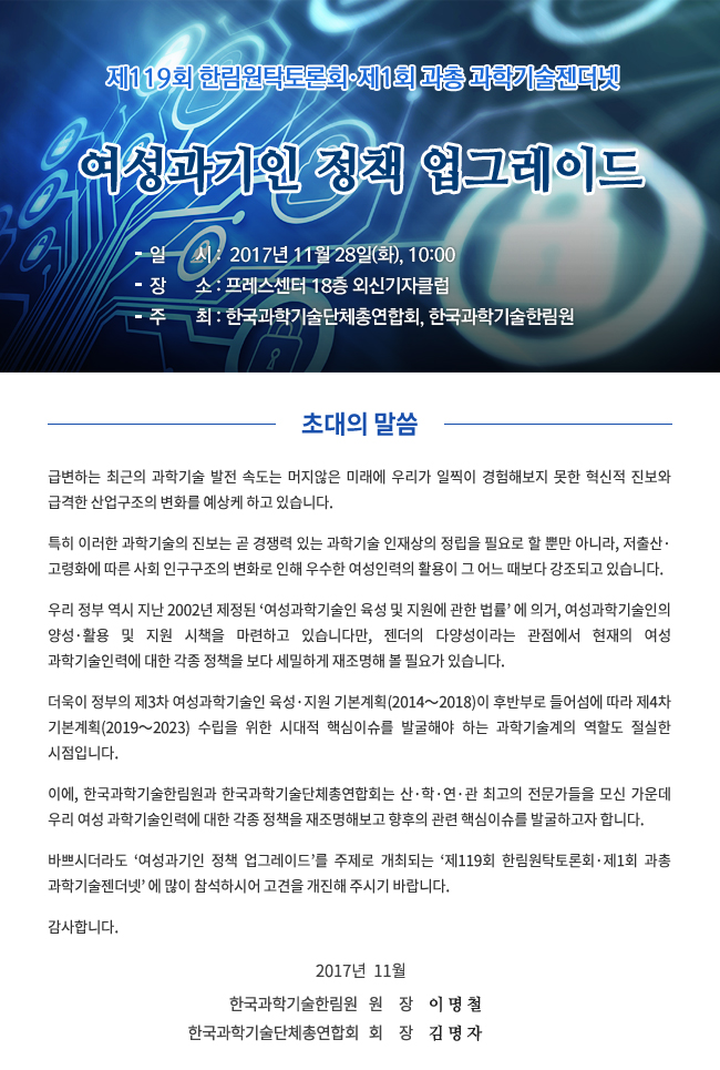 제목 [토론회] 제119회 한림원탁토론회, 제1회 과총 과학기술젠더넷