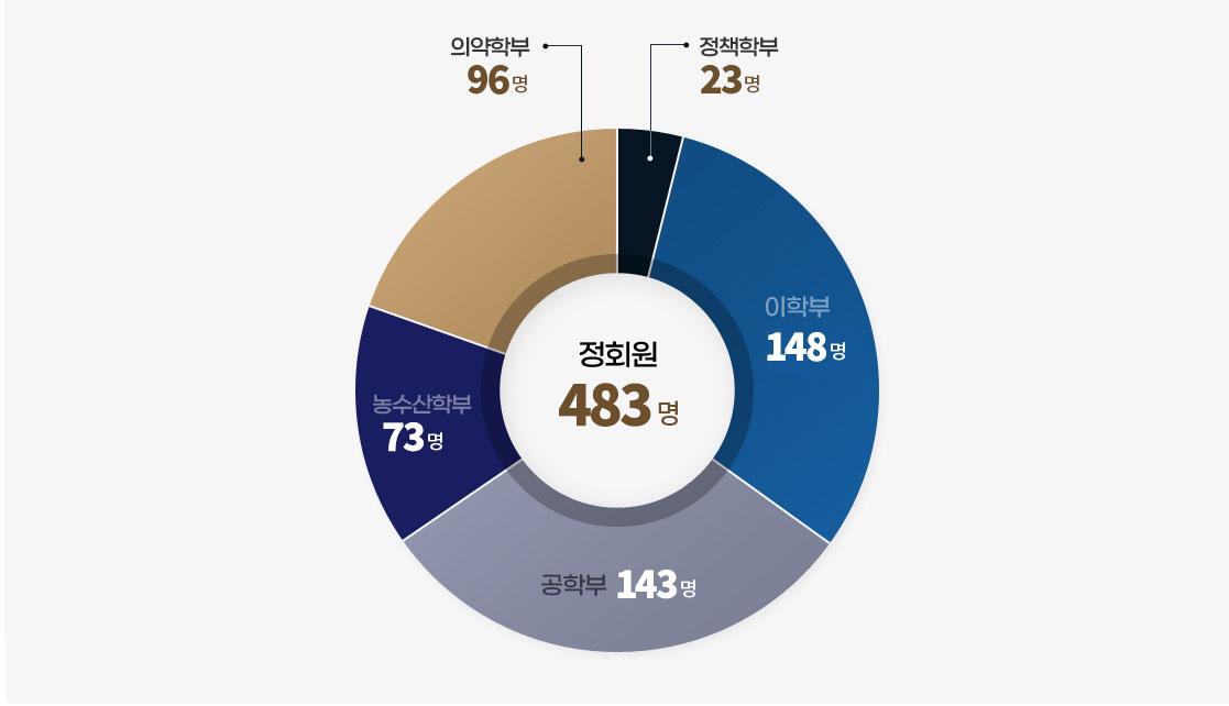 정책학, 이학, 공학, 농수산학, 의약학 등 각 학문분야를 대표하는 1,073명의 석학들이 한림원회원으로 선출되어 자신의 전문분야는 물론 더 나아가 국가발전을 위한 과학기술 진흥에 이바지하고 있습니다.