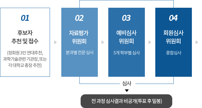 한림원은 대내적으로 학문적 수월성을 인정 받는 석학들을 영입하기 위해 엄격한 심사제도 및 회원선출절차를 시행하고 있습니다.