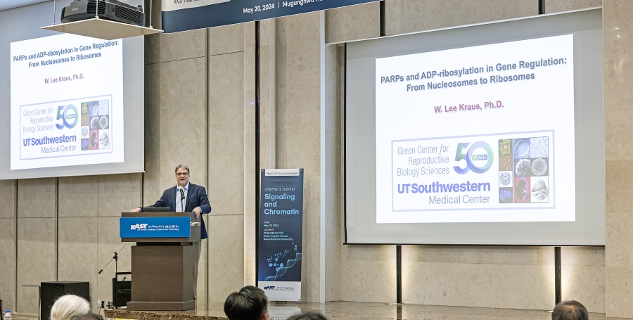 리 크라우스(W. Lee Kraus) 교수가 ‘유전자 조절의 PARP 및 ADP-리보실화: 뉴클레오솜에서 리보솜까지’를 연제로 강연하고 있다.