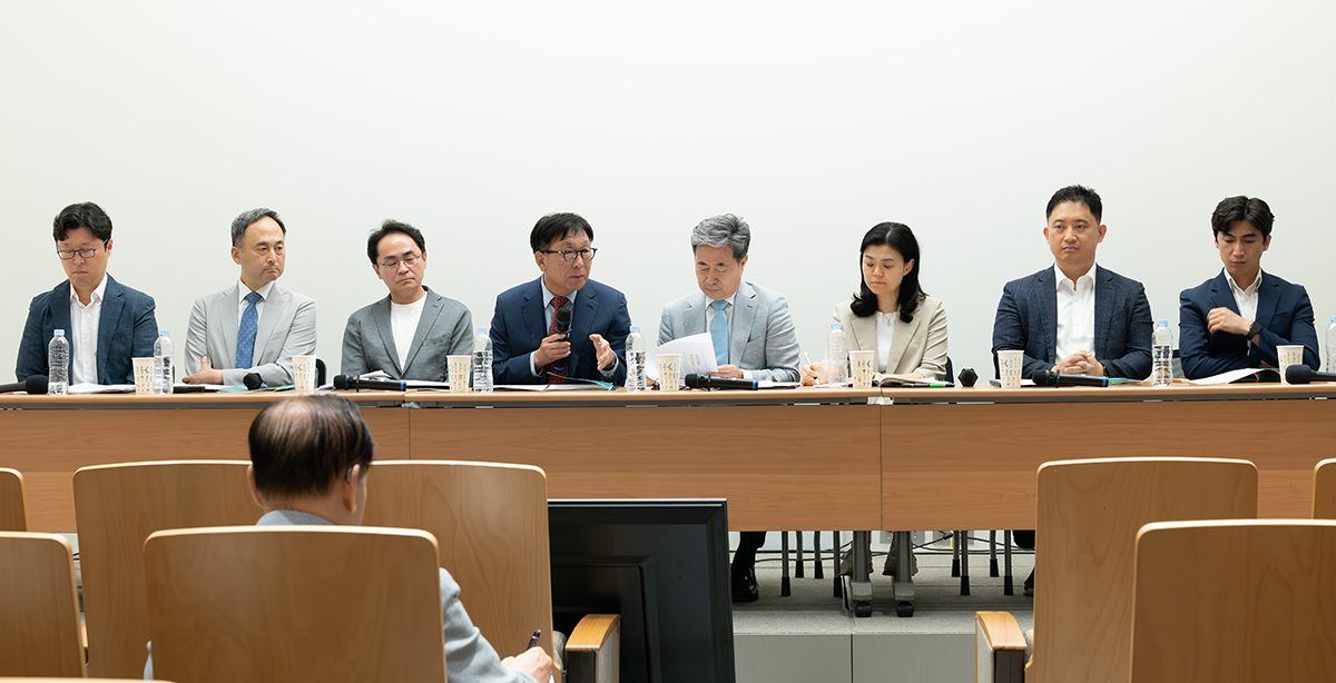 지정 및 자유토론에서 참석 전문가들이 논의를 하고 있다. (왼쪽부터) 김덕기 세종대학교 반도체시스템공학과 교수, 노원우 연세대학교 전기전자공학부 교수, 최용수 SK 엔펄스 개발실장/CTO, 정은승 삼성전자 DS부문 상근고문, 박흥수 나노종합기술원 원장, 이은주 과학기술정보통신부 원천기술과 과장, 김태곤 한양대학교 ERICA 스마트융합공학부 교수, 이철호 서울대학교 전기정보공학부 교수