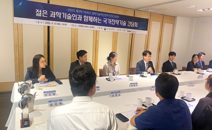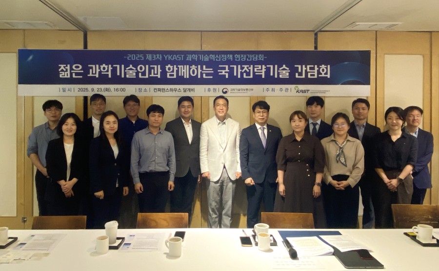 한국차세대과학기술한림원(이하 YKAST)은 9월 23일(화), 과학기술정보통신부(이하 과기정통부)와 함께 '2025 제3차 과학기술혁신정책 현장간담회'를 개최했다. 이번 간담회는 '미래를 설계하는 젊은 과학기술인의 국가전략기술 구상'을 주제로 진행되었으며, 박인규 과학기술혁신본부장 등 과기정통부 관계자들이 참석해 YKAST 소속 신진 과학기술인 13인의 목소리를 경청했다.