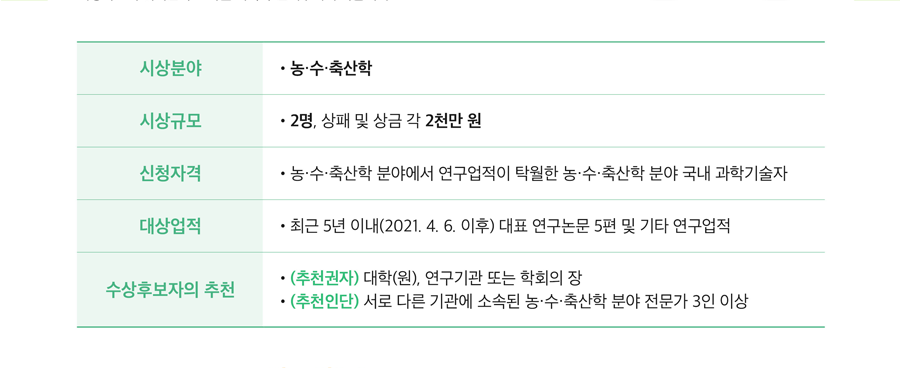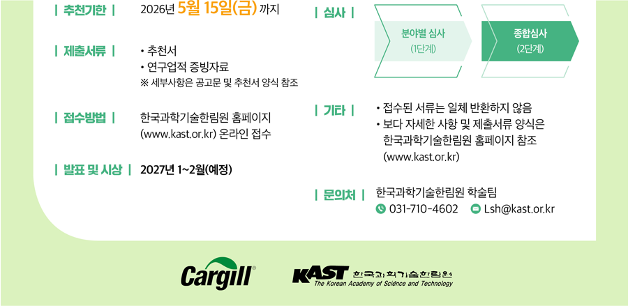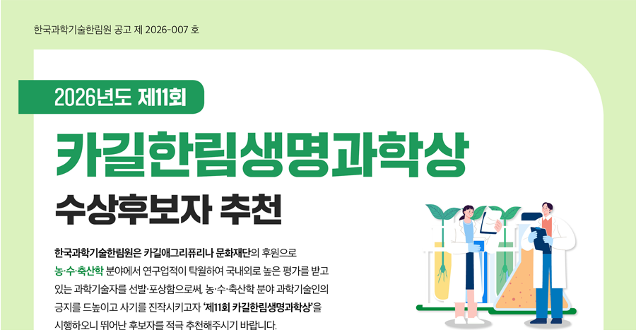PRINT 2026년도 제11회 카길한림생명과학상 수상후보자 추천 공고 이름 | 관리자 Date | 2026-04-03 Hit | 183 2026년도 제11회 카길한림생명과학상 시행공고.hwp / 2026년도 제11회 카길한림생명과학상 추천서 양식.hwp / 3. 주요업적표-총괄표(양식).xlsx ※ 카길한림생명과학상 서류 제출 페이지 바로가기(클릭) 목록 작성자학술팀 연락처031-710-4602 이전글 2026년도 에쓰-오일 과학문화재단 시상사업 수상후보자 추천 공고 다음글