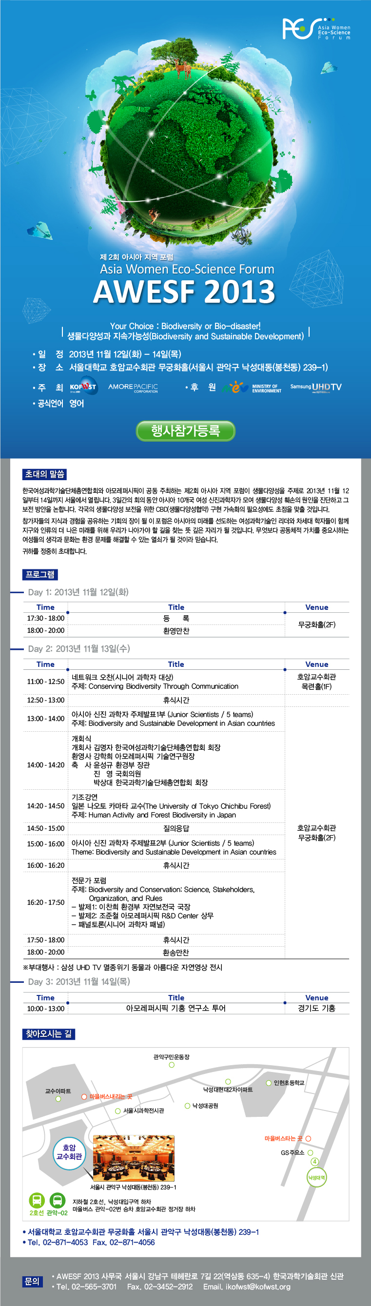 PRINT [여과총]2013 Asia Woman Eco Science Forum (AWESF 2013) 이름 | 관리자 Date | 2013-10-29 Hit | 12128 목록 작성자 연락처 이전글 [과실연] \'창조경제의 적을 해부한다\' 포럼 개최 안내 다음글 과학기술인명예의전당 퀴즈 골든벨 참가자 공모