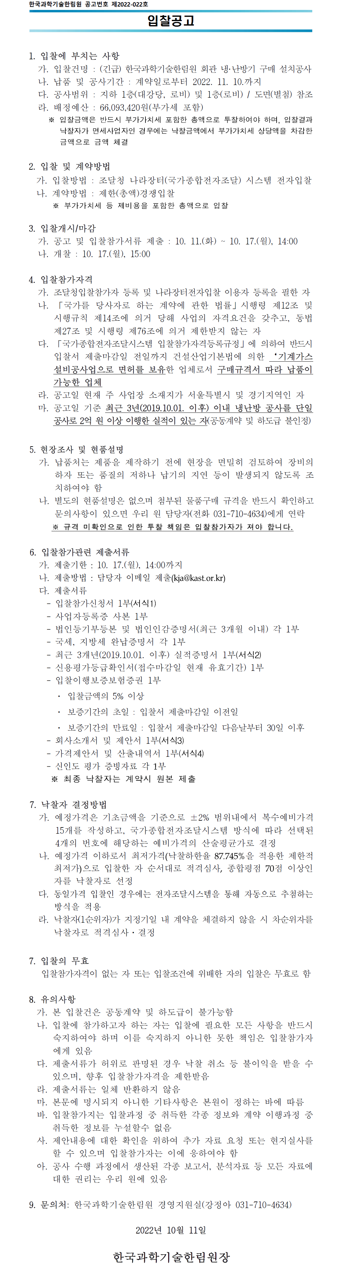 PRINT [입찰공고] (긴급) 한국과학기술한림원 회관 냉·난방기 구매 설치공사 이름 | 관리자 Date | 2022-10-11 Hit | 3976 목록 작성자경영지원실 연락처031-710-4634 이전글 [채용공고] (연장공고) 2022년도 직원(수행기사) 채용 다음글 한국과학기술한림원 직원 승진심사 실행계획 공고
