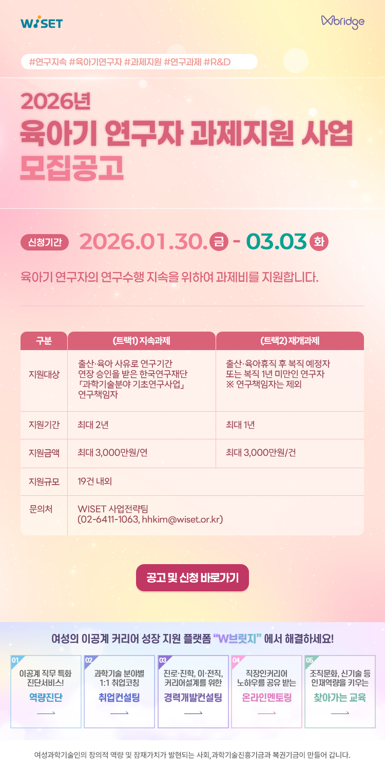 [WISET] 2026년 육아기 연구자 과제지원 사업 공고