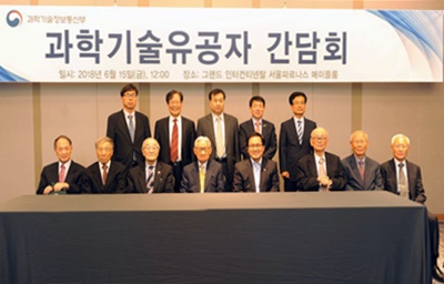 과학기술유공자, 유영민 과기정통부 장관과 사회적 가치 실현 공유- 15일 그랜드인터컨티넨탈호텔서 ‘과학기술유공자 간담회’ 개최- 국가 과학기술 발전 방안 및 과학기술유공자 예우에 대한 의견 청취[참석자 단체 사진: (아랫줄 왼쪽부터)윤덕용·이창건·이호왕·조완규 박사, 유영민 과학기술정보통신부 장관, 정길생·민계식 박사 (윗줄 왼쪽부터)김형룡 교수(과학기술유공자센터 전문위원), 유장렬 과학기술유공자지원센터장, 유욱준 한국과학기술한림원 총괄부원장, 이진규 과학기술정보통신부 제1차관, 강병삼 과학기술정보통신부 미래인재...