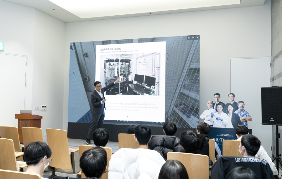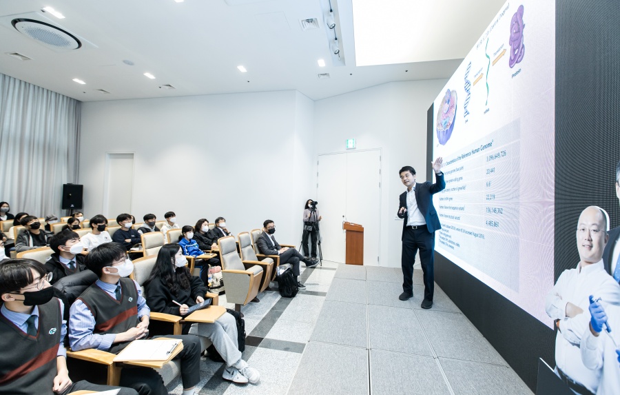 첫 강연자인 이정호 KAIST 교수는 '정밀의학 기반 뇌신경질환 혁신 RNA 신약 개발'을 본인이 하고 있는 연구로 소개하고, 학생들에게 '인간의 난치성 뇌질환은 왜, 어떻게 일어나는 것인지', 또 '유전학적 수준의 새로운 이해를 바탕으로 더 나은 진단과 효과적인 치료법을 개발할 수 있을지' 등을 VR실험실과 발표자료를 넘나들며 쉽고 흥미롭게 설명했다.