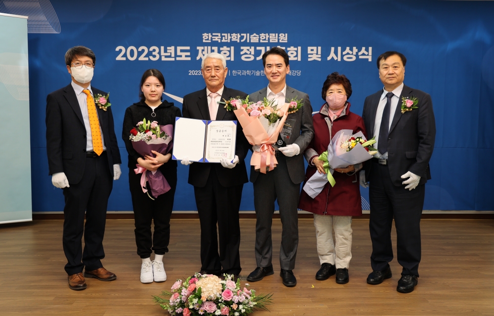 최승재 셀트리온 부사장(좌측 첫번째), 최승홍 교수(좌측 네번째), 유욱준 한림원장(우측 첫번째)와 수상자 가족 단체사진