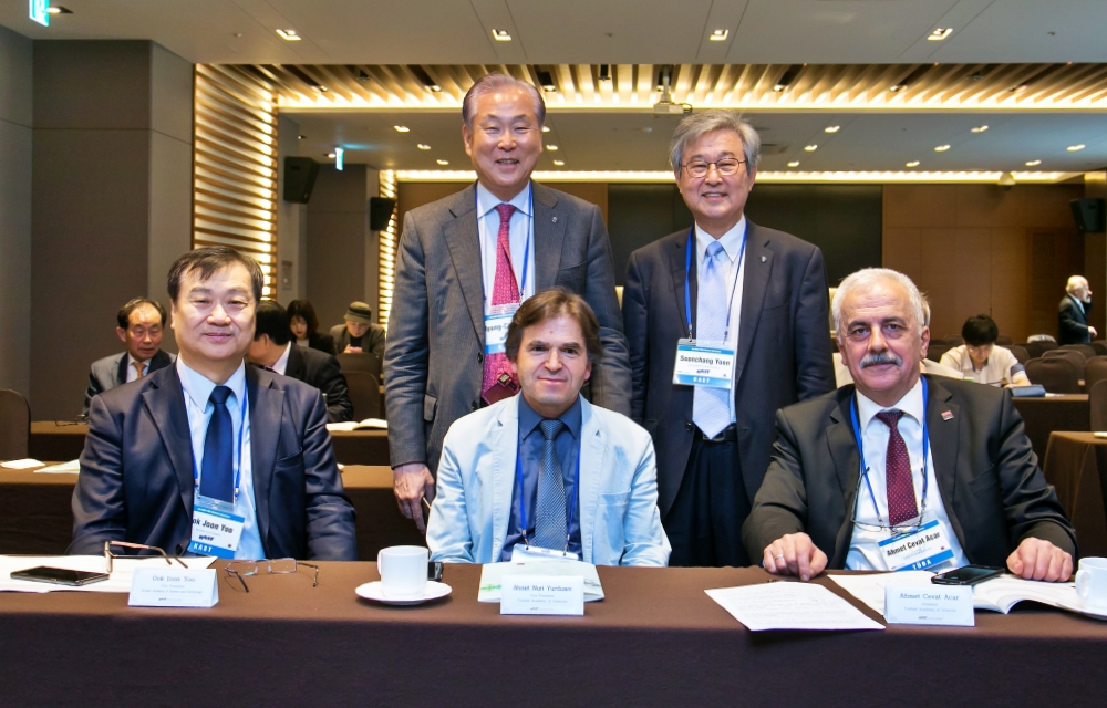 △2018년 개최된 제3회 한국-튀르키예한림원 공동심포지엄 현장에서 (왼쪽부터) 유욱준 한림원 원장, 이명철 한림원 前원장, 아흐멧 누리 욜두세브 AASSA 회장, 윤순창 서울대 명예교수, 아흐멧 세밧 아카르 튀르키예한림원 前원장