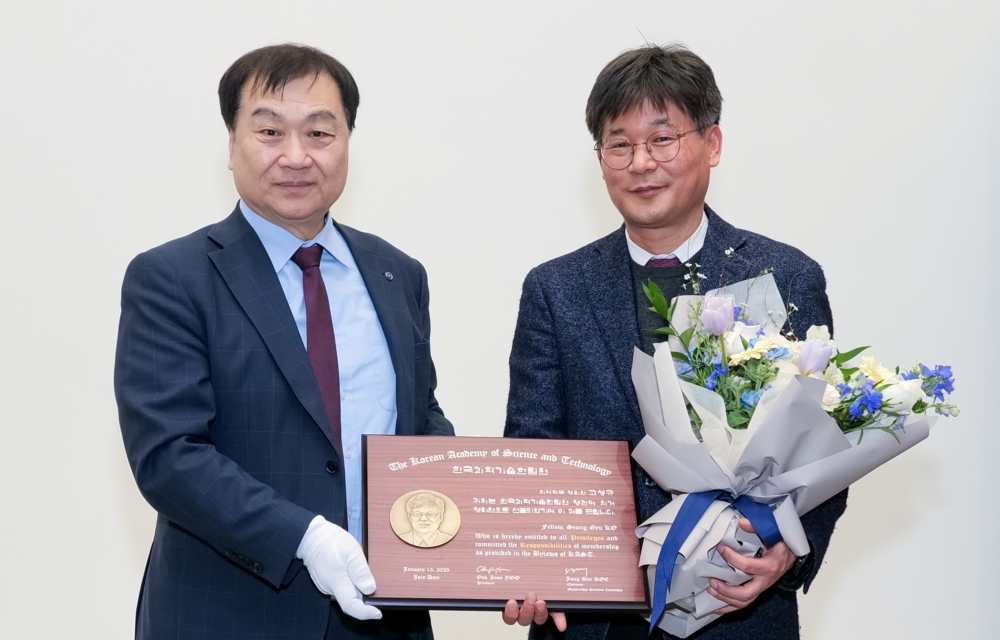 고성규 교수의 신입회원패 수여 기념사진((좌) 유욱준 한림원 원장, (우) 고성규 경희대 교수)