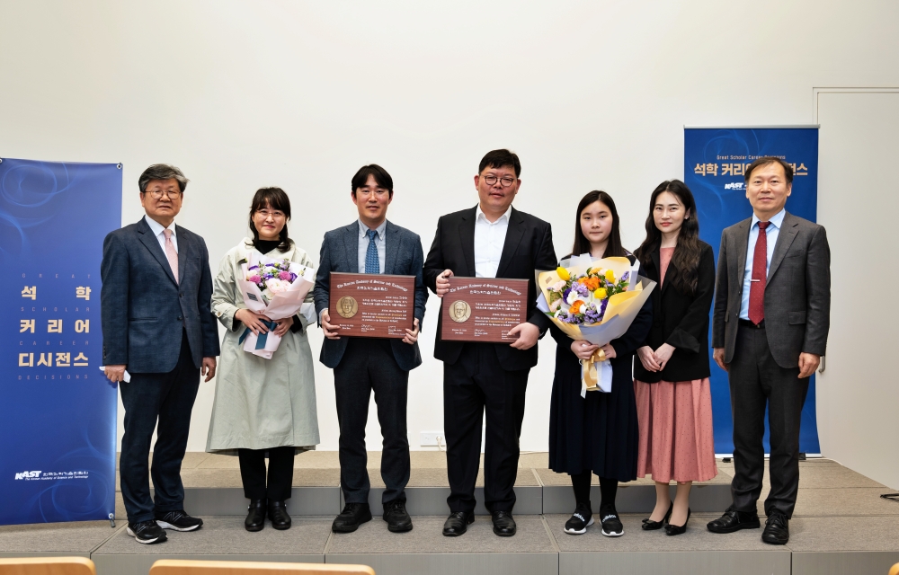 고승환 교수(왼쪽에서 세 번째)와 권일한 교수(왼쪽에서 네 번째)의 회원패 수여 기념사진