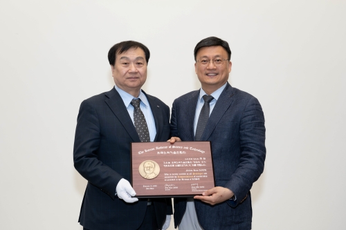 (왼쪽 사진) 국현 전남대학교 교수와 (오른쪽 사진) 민정준 전남대학교 교수의 신입회원패 수여 기념사진