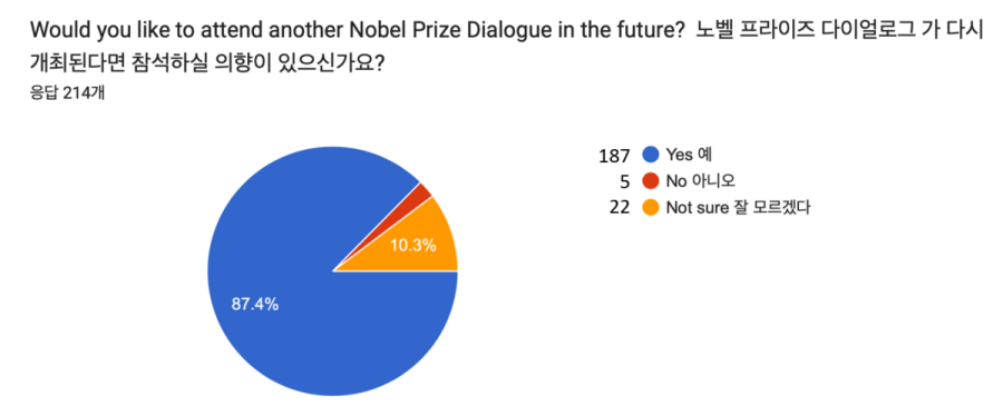 셋째, 한국인 학자와 학생들에게 해외 석학들과 함께하는 글로벌 ‘무대’를 제공하였다. 이번 행사는 10개 이상의 세부 세션으로 구성되었는데 그중 상당수 세션에서 한국인이 연사 또는 패널로 참여하였다. ‘노벨프라이즈 다이얼로그’와 같은 글로벌 행사에서 한국인의 존재감과 자신감을 전 세계에 피력하는 귀중한 기회였다고 생각한다. 강연과 패널토론을 지켜보면서 ‘한국도 어느새 이 정도의 행사를 성공적으로 유치하고 개최할 수 있는 나라가 되었구나’ 하는 생각과 동시에, ‘한국인 참가자들이 노벨상 수상자들과 함께 패널석에 둘러앉아 저렇게 자신감 있게 자신의 의견을 말할 수 있게 되었구나’ 하는 자부심이 들었다. 한국인 석학들에게도 그렇겠지만, 자라나는 학생들에게 글로벌 무대 경험이 주어졌다는 점도 매우 인상적이었다. 앞으로 과학자로 성장해나갈 학생들에게 평생 기억에 남을 소중한 동기부여의 시간이 되었을 것으로 생각된다.