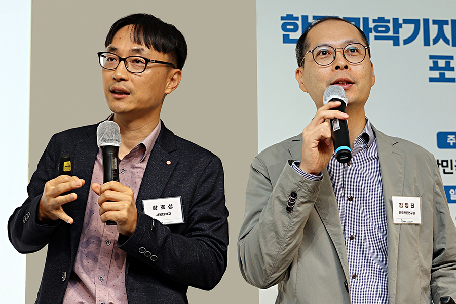 주제발표에는 황호성 서울대 교수(왼쪽)와 김명진 한국천문연구원 책임연구원(오른쪽)이 참여했다.