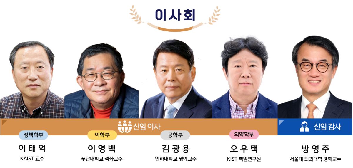 한국과학기술한림원(이하 한림원)은 지난 10월 6일부터 31일까지 소속학부 및 전체 정회원을 대상으로 진행된 '2024년도 이사 및 감사 선출 투표' 결과에 따라 2024년 신임 이사로 이태억 정책학부 정회원(KAIST 산업및시스템공학과 교수), 이영백 이학부 정회원(中푸단대학교 석좌교수), 김광용 공학부 정회원(인하대학교 기계공학과 명예교수), 오우택 의약학부 정회원(KIST 책임연구원) 등 4인을, 신임 감사로 방영주 의약학부 정회원(서울대학교 의과대학 명예교수)을 인준했다.