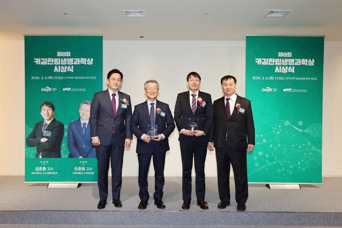 한국과학기술한림원은(원장 유욱준·이하 한림원)과 카길애그리퓨리나(대표 박종억) 문화재단은 ‘제8회 카길한림생명과학상’ 수상자로 김준환 제주대학교 수산생명의학과 교수와 이존화 전북대학교 수의과대학 교수를 선정하고, 6일 한림원회관에서 시상식을 개최했다. 현장에는 유욱준 한림원 원장, 박종억 카길애그리퓨리나 대표, 수상자 및 가족 등을 포함하여 약 20여 명이 참석했다.