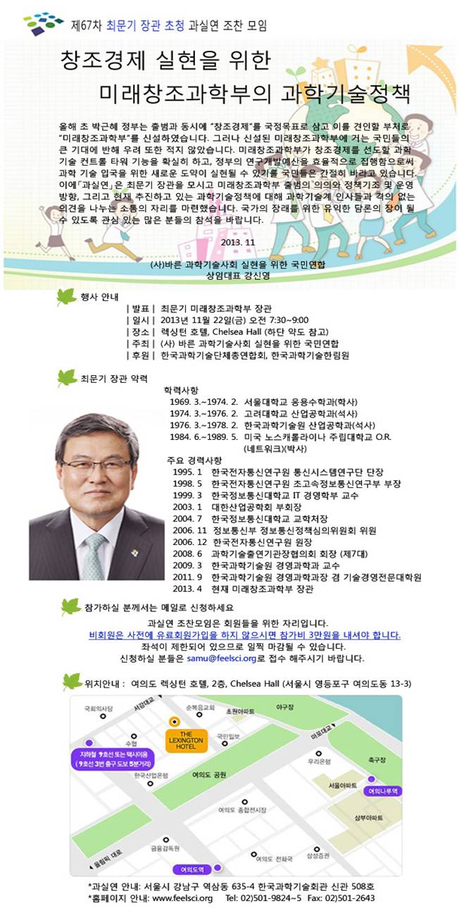 PRINT [과실연] 최문기 장관 초청 조찬 모임 개최 안내 이름 | 관리자 Date | 2013-11-15 Hit | 11107 목록 작성자 연락처 이전글 과학기술인명예의전당 퀴즈 골든벨 참가자 공모 다음글 2013년도 제 2회 정기총회 개최