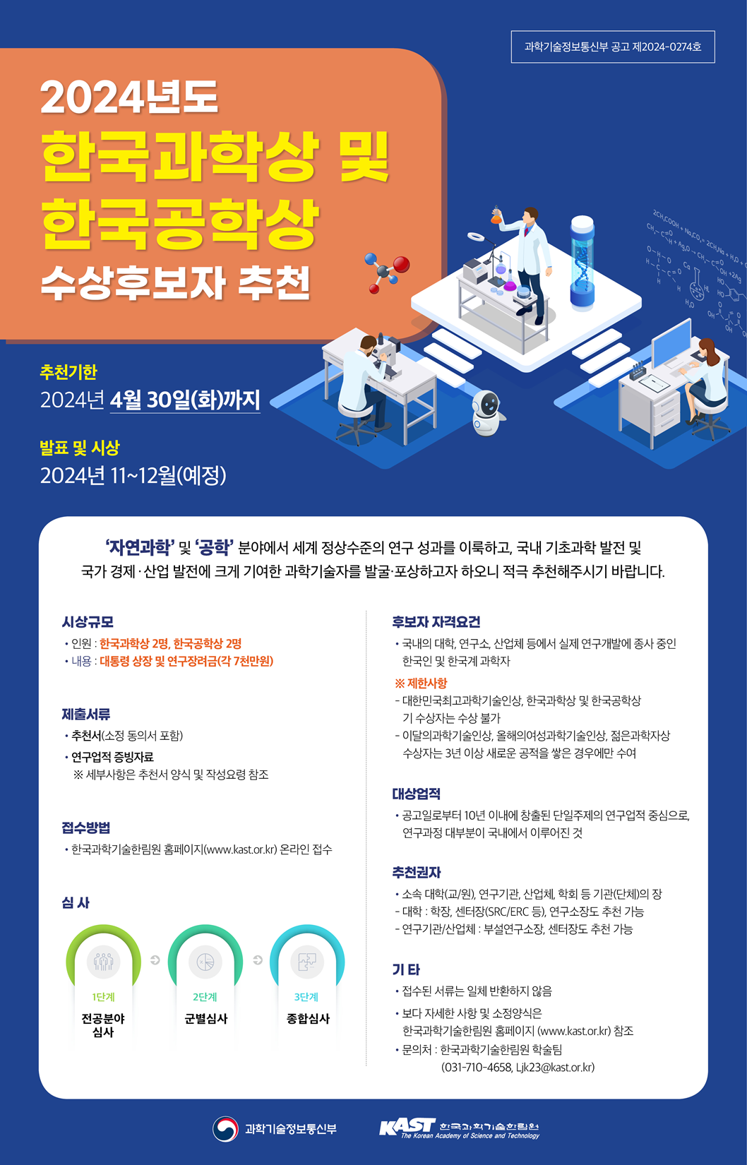 2024년 한국과학상 및 한국공학상(대통령상) 수상후보자 추천 공고