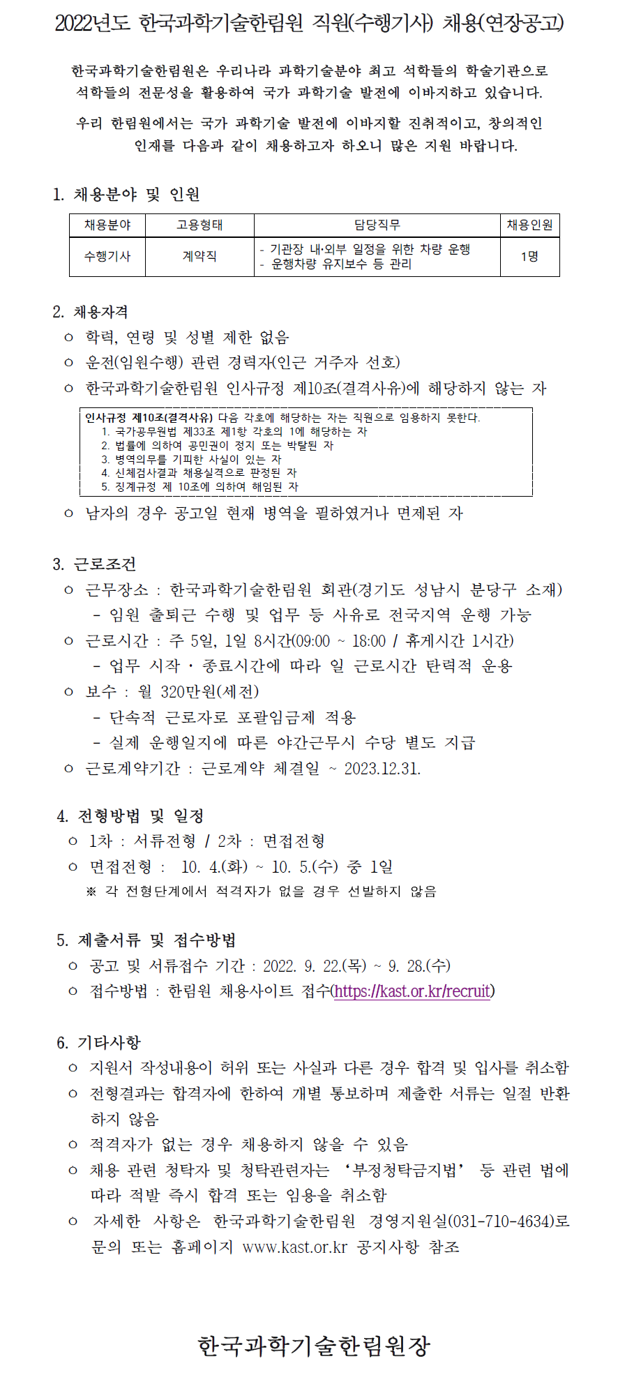 PRINT [채용공고] (연장공고) 2022년도 직원(수행기사) 채용 이름 | 관리자 Date | 2022-09-22 Hit | 4448 목록 작성자 연락처 이전글 [입찰공고] 한국과학기술한림원 회관 시설종합관리용역 다음글 [입찰공고] (긴급) 한국과학기술한림원 회관 냉·난방기 구매 설치공사