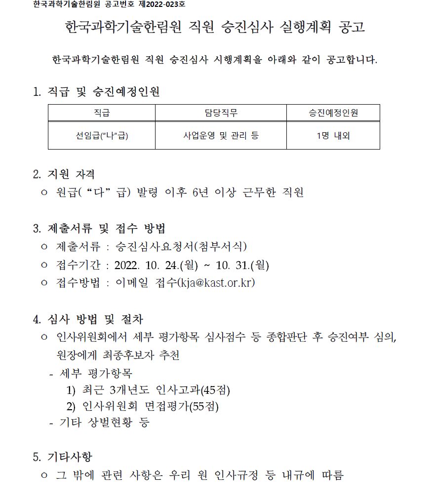 PRINT 한국과학기술한림원 직원 승진심사 실행계획 공고 이름 | 관리자 Date | 2022-10-24 Hit | 4424 승진심사요청서(서식).hwp 목록 작성자경영지원실 연락처031-710-4634 이전글 [입찰공고] (긴급) 한국과학기술한림원 회관 냉·난방기 구매 설치공사 다음글 [채용] 2022년도 한국과학기술한림원 직원 채용(8차) 공고