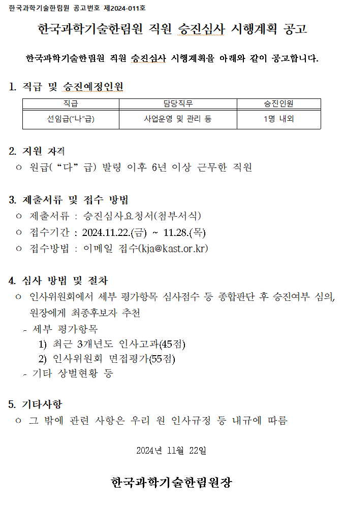 PRINT 직원 승진심사 시행계획 공고 이름 | 관리자 Date | 2024-11-22 Hit | 3842 공고.pdf / 승진심사요청서(양식)_최종.hwp 목록 작성자경영지원실 연락처031-710-4634 이전글 2024년 직원 채용(일반행정 / 계약직(주임행정원(다급)) 최종합격자 안내 다음글 [입찰공고] 2025 대한민국 과학기술유공자 교육만화 제작용역 입찰공고