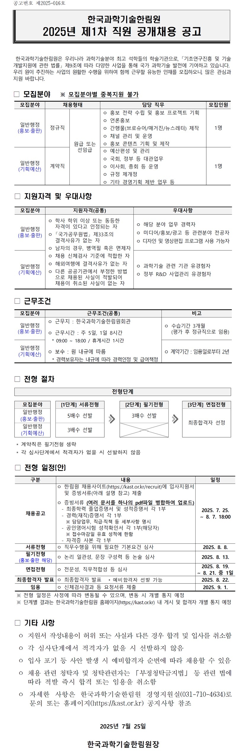 [채용] 한국과학기술한림원 2025년 제1차 직원 공개채용 공고(홍보출판, 기획예산)