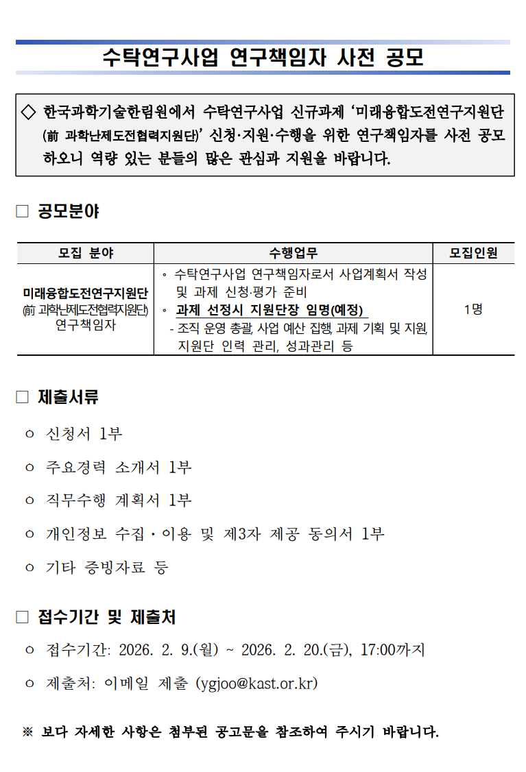 한국과학기술한림원 수탁연구사업 연구책임자 사전 모집 공고