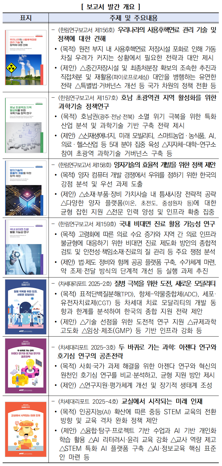 □ 한국과학기술한림원(원장 정진호, 이하 한림원)은 △사용후핵연료 관리 △호남 초광역권 활성화 △양자 기술 개발 △비대면진료 제도화 △질병 치료 모달리티* 개발 전략 △기초과학 연구지원 방향 △AI시대의 STEM 교육 등을 주제로 한림연구보고서 4종 및 차세대리포트 3종 등 2025년도 한림석학정책연구 보고서 7권을 발간했다.
