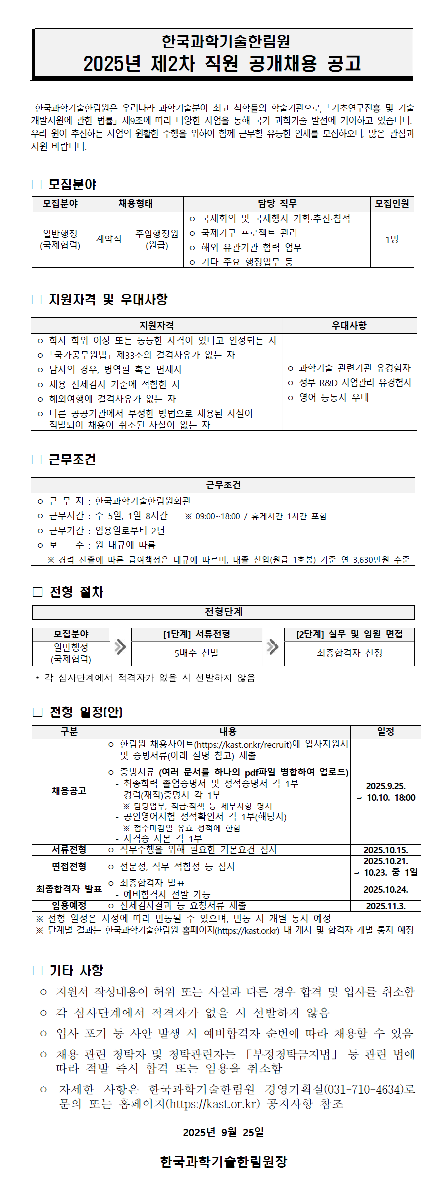한국과학기술한림원 2025년 제2차 직원 공개채용 공고(국제협력) 이름 | 관리자 Date | 2025-09-24 Hit | 837 채용공고문_국제협력.hwp 목록 이전글 (변경) 수탁연구사업단(기초과학네트워킹센터, 국민생활안전종합지원단) 직원 채용 재공고(2차) 다음글 수탁연구사업단(국민생활안전종합지원단) 직원 채용 공고